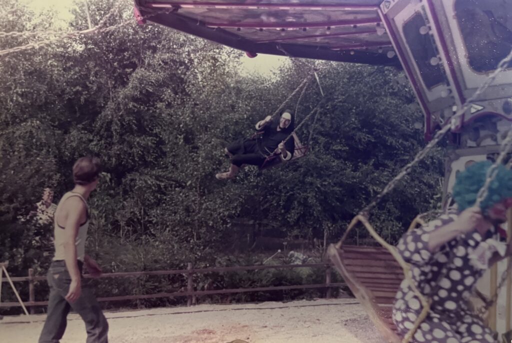 Op de foto’s hieronder zien wij Jaap Boontjes en Rini Hulshof in de zweefmolen. Zoals jullie kunnen zien hebben ze geen normale kleding aan. Deze kermis werd toen gecombineerd met gekostumeerd voetbal. Ook jarenlang een daverend